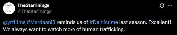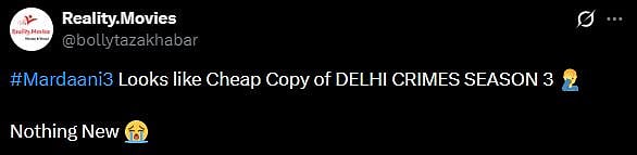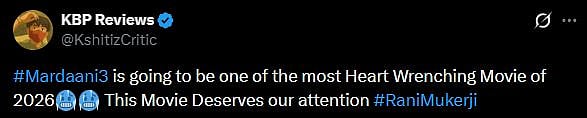 A netizen tweeted, “#Mardaani3 is going to be one of the most Heart Wrenching Movie of 2026 This Movie Deserves our attention #RaniMukerji (sic).” Another X user wrote, “#Mardaani3 Looks like Cheap Copy of DELHI CRIMES SEASON 3