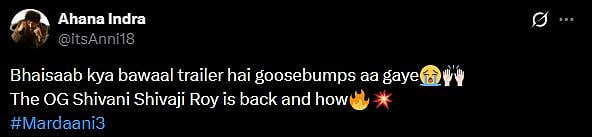 One more netizen tweeted, “Bhaisaab kya bawaal trailer hai goosebumps aa gaye The OG Shivani Shivaji Roy is back and how #Mardaani3 (sic).” Check out the tweets below…