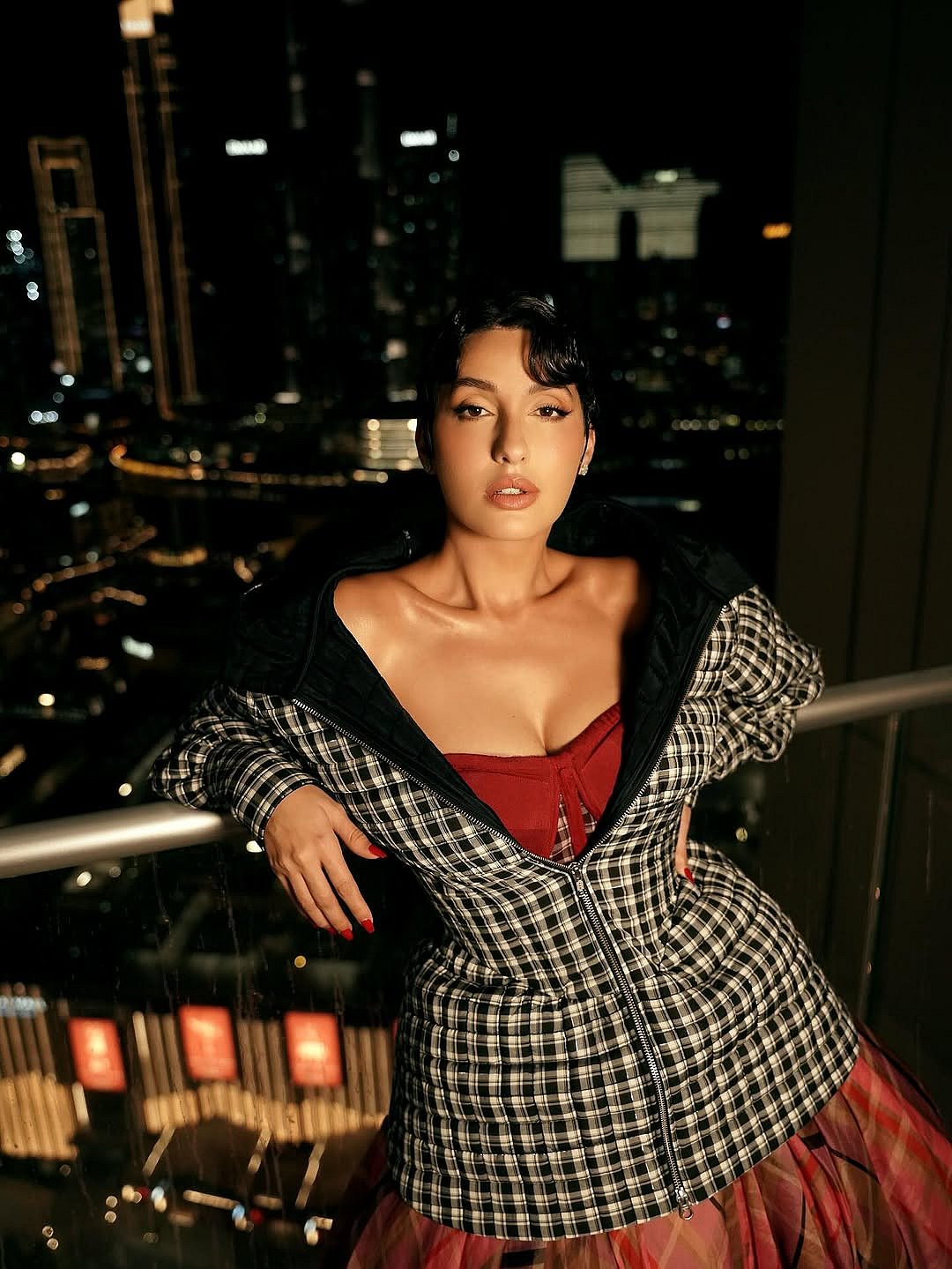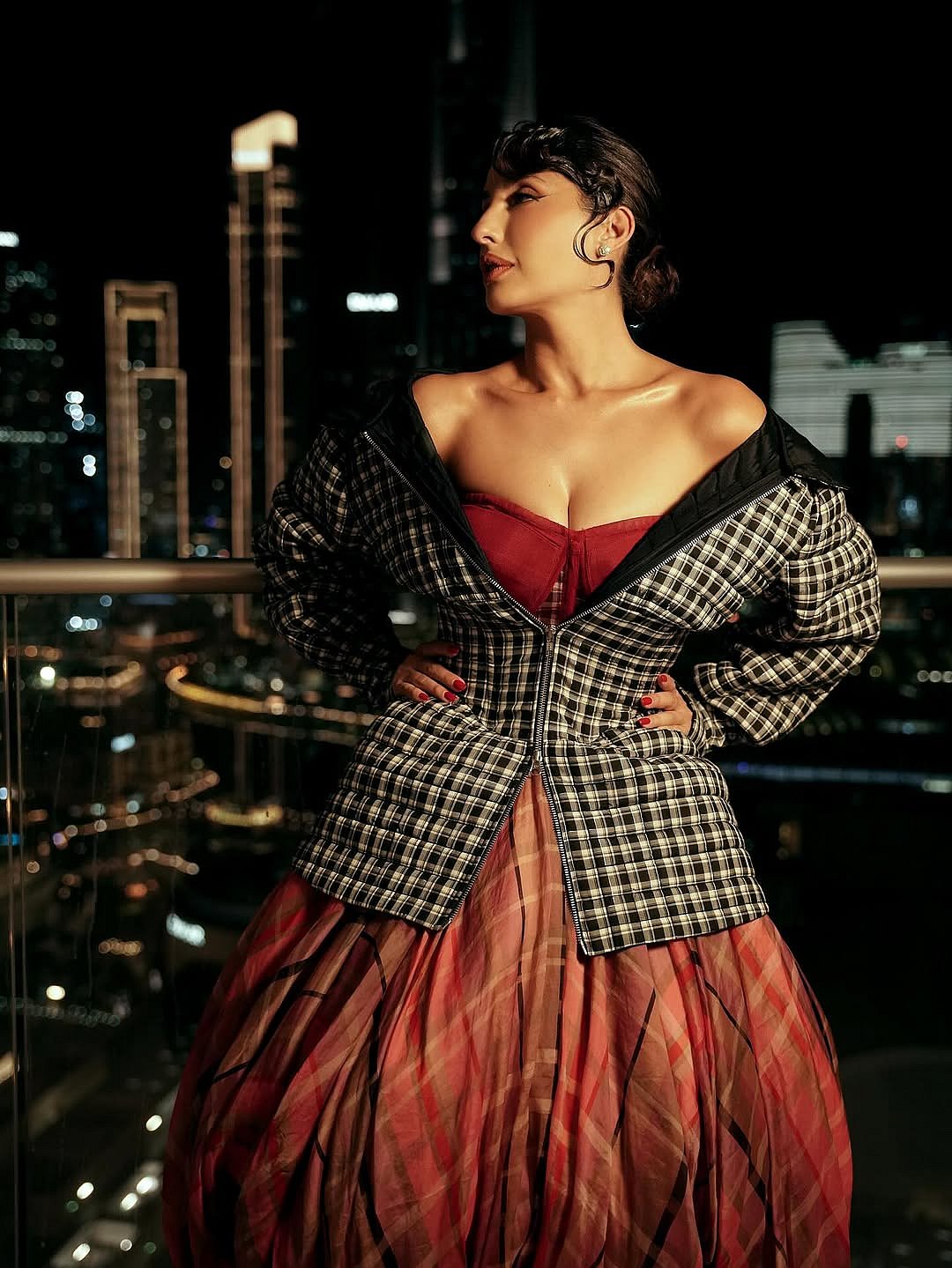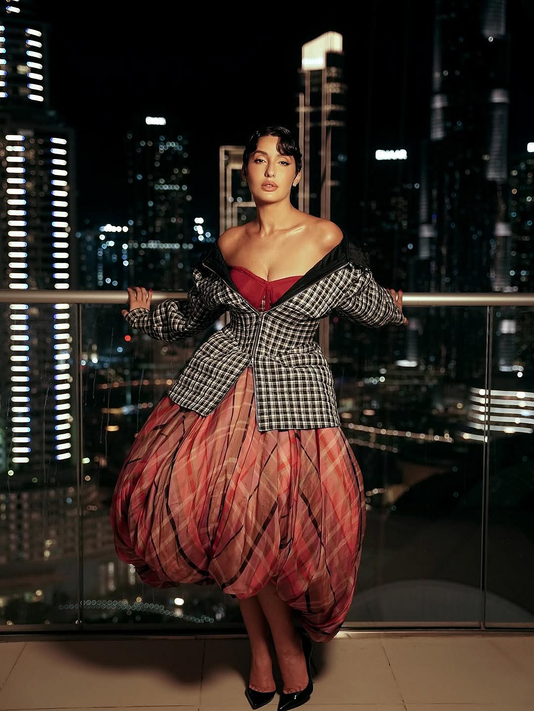 Nora Fatehi attended Rahul Mishra’s Spring-Summer 2026 showcase in Dubai, where the designer unveiled his “Fresh” collection under AFEW Rahul MishraShe turned the fashion presentation into her own runway moment, instantly commanding attention with her presenceNora wore a pink plaid corset gown that highlighted her structured, powerful silhouetteShe layered the look with a black-and-white checkered jacket, creating a striking contrast against the soft pink gownHer look embodied the spirit of Fresh, which reimagined the classic Madras check with modern details like embroidery and dragonfly motifsThe ensemble blended strength and femininity, reflecting the balance of Mishra’s collectionAdding to the glamour, Nora used the occasion to launch her global single “Just a Girl” featuring Shenseea, cementing her dual identity as a fashion and music icon